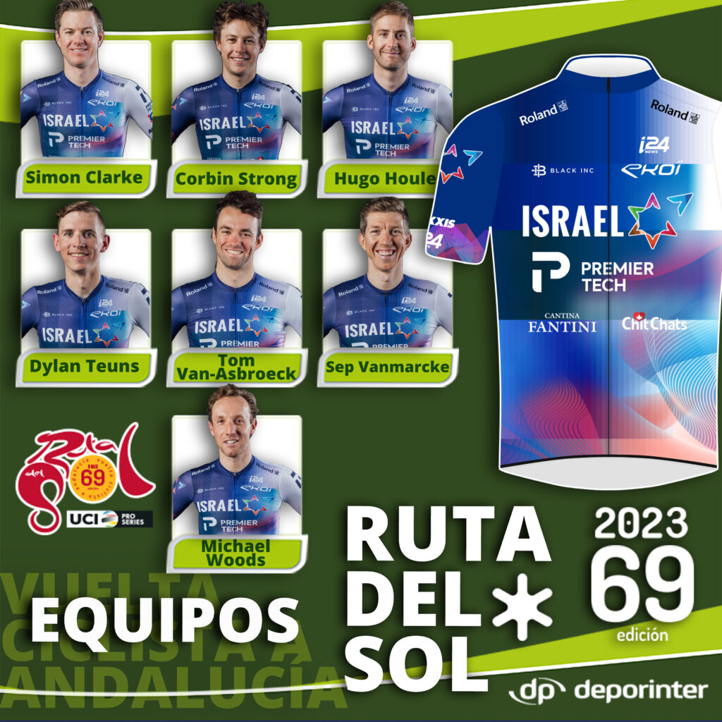 El Israel – Premier Tech llega a la Ruta del Sol 2023 con un equipo de corredores para todo tipo de terrenos, buenos llegadores cuando la carretera se empina y que pueden estar delante en la lucha por las etapas y la general final. El belga Dylan Teuns, ganador de la Flecha Balona del año pasado; el australiano Simon Clarke, vencedor de una etapa en el Tour de Francia y dos en la Vuelta a España, y Michael Woods, bronce en el Mundial, son las principales bazas de un equipo que aspira a todo. El belga Sep Vanmarcke, el también canadiense Hugo Houle, el llegador Ton Van Asbroeck y el neozelandés Corbin Strong completan la formación israelita para la 69ª edición de la Vuelta a Andalucía.
